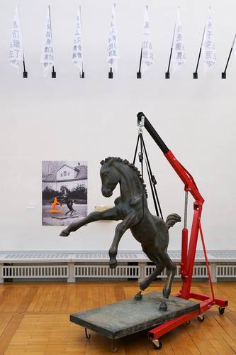 SPRINGENDES FOHLEN (AUS DER SERIE "DER WEIMARHALLENPARK") Installation, 2021 Reproduktion eines Archivbildes, 3D-Druck, Reproduktion eines Archivaktenauszuges, originale Bronze und Werkstattkran variabel ©Konstantin BayerSPRINGENDES FOHLEN (AUS DER SERIE "DER WEIMARHALLENPARK") Installation, 2021 Reproduktion eines Archivbildes, 3D-Druck, Reproduktion eines Archivaktenauszuges, originale Bronze und Werkstattkran variabel ©Konstantin Bayer